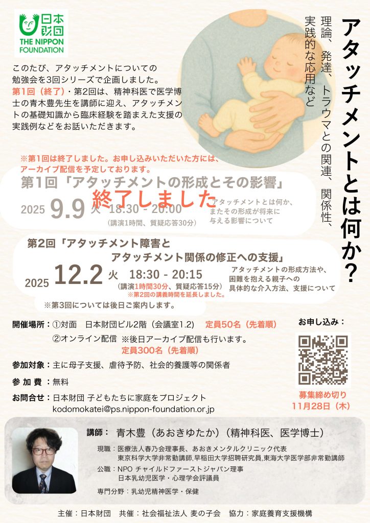 日本財団主催 社会福祉法人麦の子会共催 「アタッチメントとは何か?」3回シリーズ勉強会のお知らせ