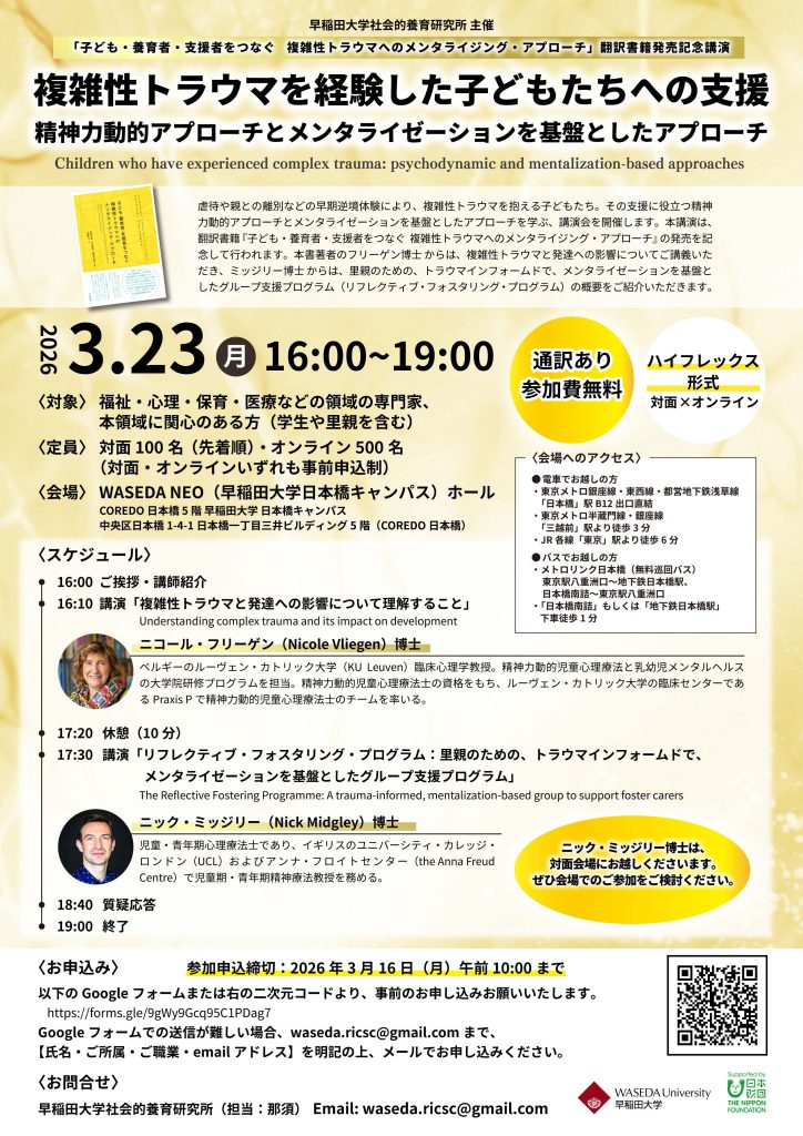 日本財団助成 早稲田大学社会的養育研究所主催 講演会「複雑性トラウマを経験した子どもたちへの支援〜精神力動的アプローチとメンタライゼーションを基盤としたアプローチ」開催のお知らせ